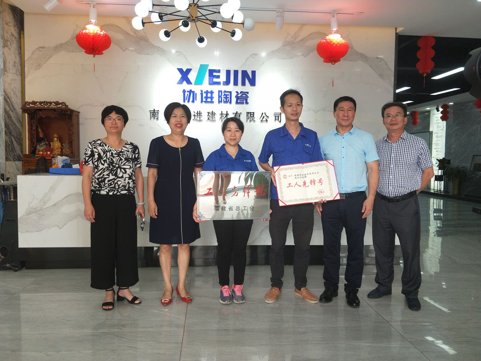 2019年5月16日下午,南安市總工會黨組書記常務(wù)副主席黃海鷹在鎮(zhèn)工會主席李彩芳的帶領(lǐng)下,特地來公司為技術(shù)綜合部頒發(fā)省級“工人先鋒號”匾牌。公司技術(shù)綜合部,瞄準(zhǔn)市場需求,攻克技術(shù)難題,銳意進(jìn)取,在外墻、內(nèi)墻、大板、薄板等瓷磚領(lǐng)域的技術(shù)上都有新的突破。被福建省總工會評為五一“工人先鋒號”。
